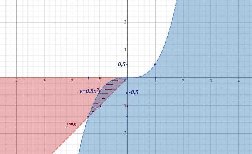 Решением системы неравенств будет пересечение указанных выше областей , то есть это часть плоскости , находящаяся в 3 четверти между прямой у=х и кубической параболой у=0,5x³ . Область заштрихована .