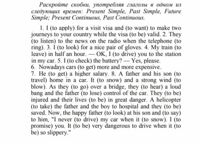 - Yes, please.6. Nowdays cars are getting more and more expensive.. 7. He gets a higher salary.8. A father and his son were travelling home in a car. It was snowing and a strong wind was blowing. As they were going over a bridge, they heard a loud bang and the father lost control of the car. They were injured and their lives were in great danger. A helicopter took the father and the boy to hospital and they were saved. Now, the happy father is looking at his son and saying to him : "I will never drive my car when it snows. I promise you. It is very dangerous to drive when it is so slippery." (я так поняла )