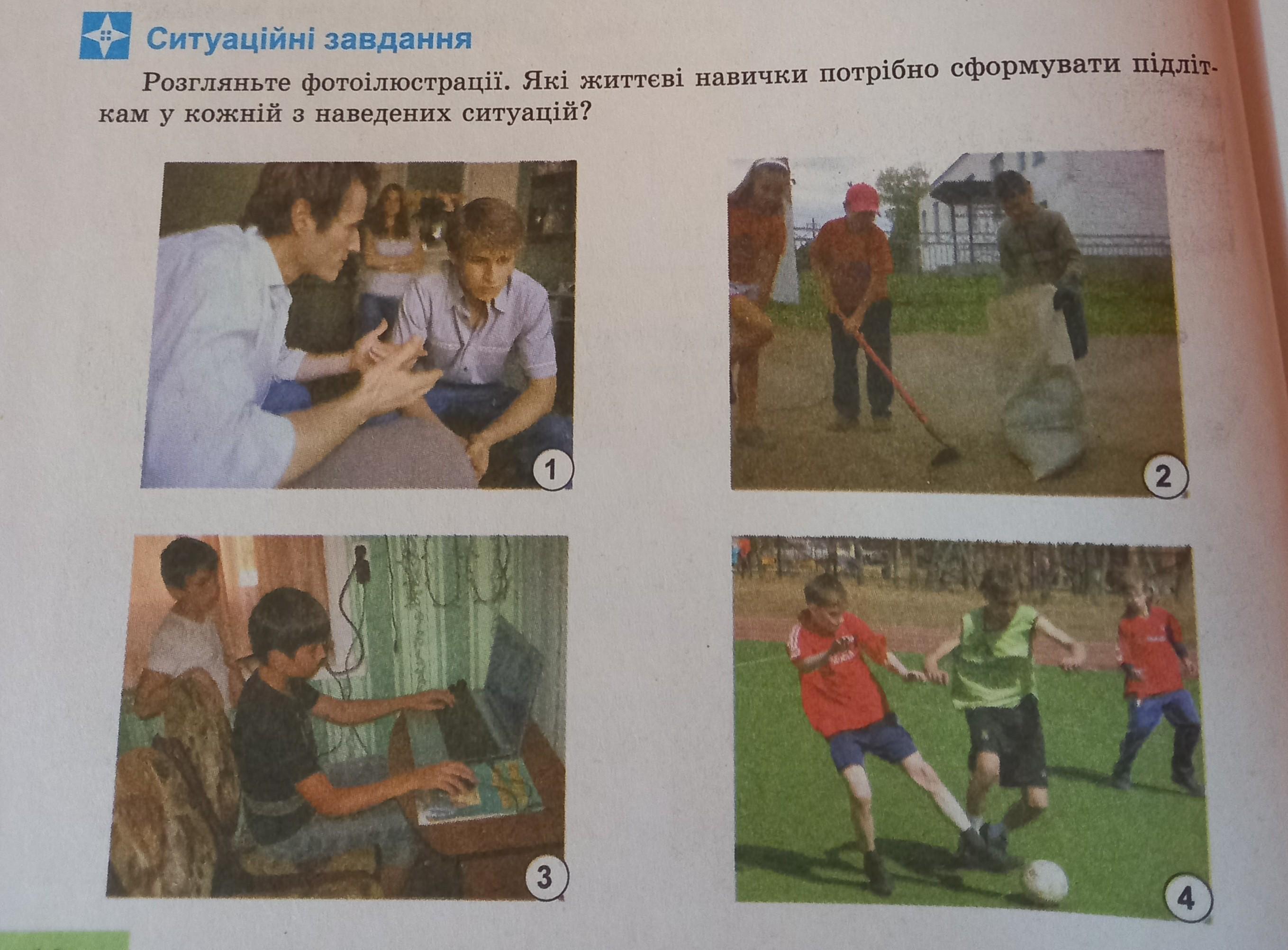 Розгляньте фотоілюстрації. Які життєві навички потрібно сформувати підліткам у кожній з наведених ситуацій?