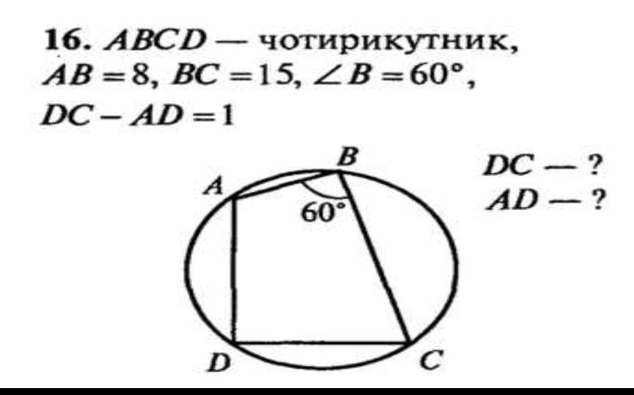АС = √(8² + 15²- 2*8*15*cos60°) = √(64 + 225 – 240*(1/2)) =