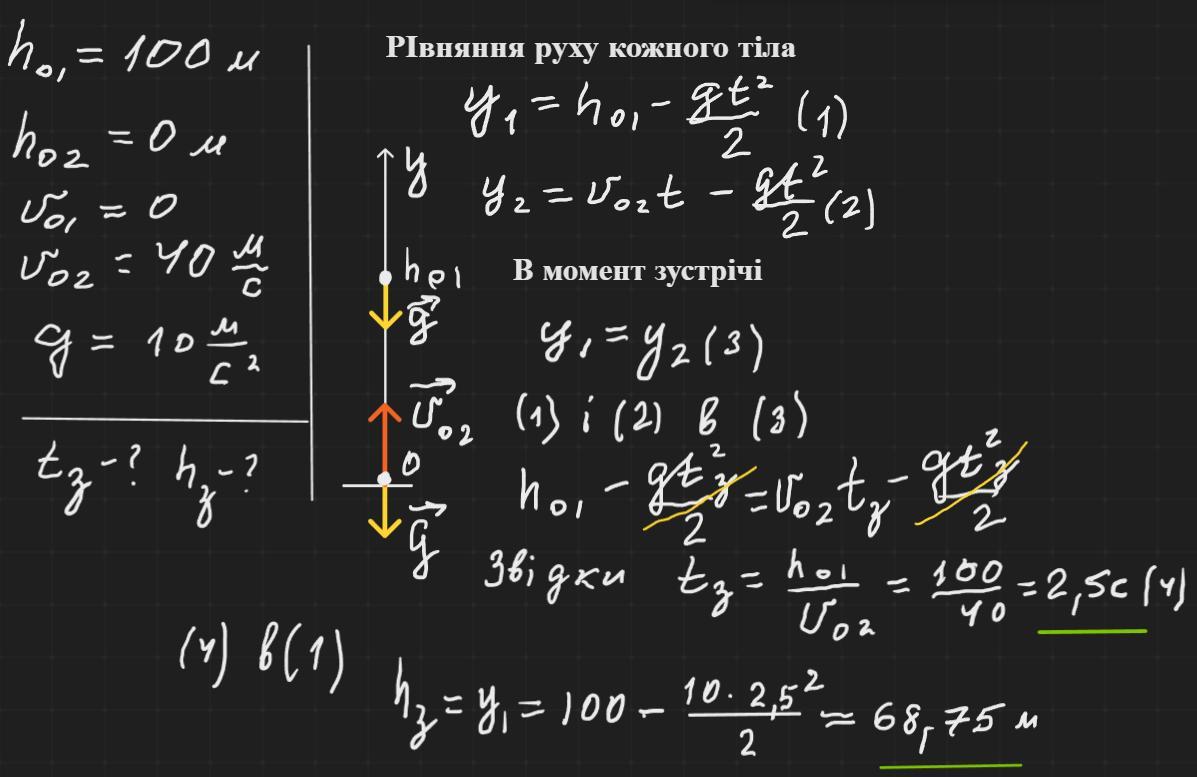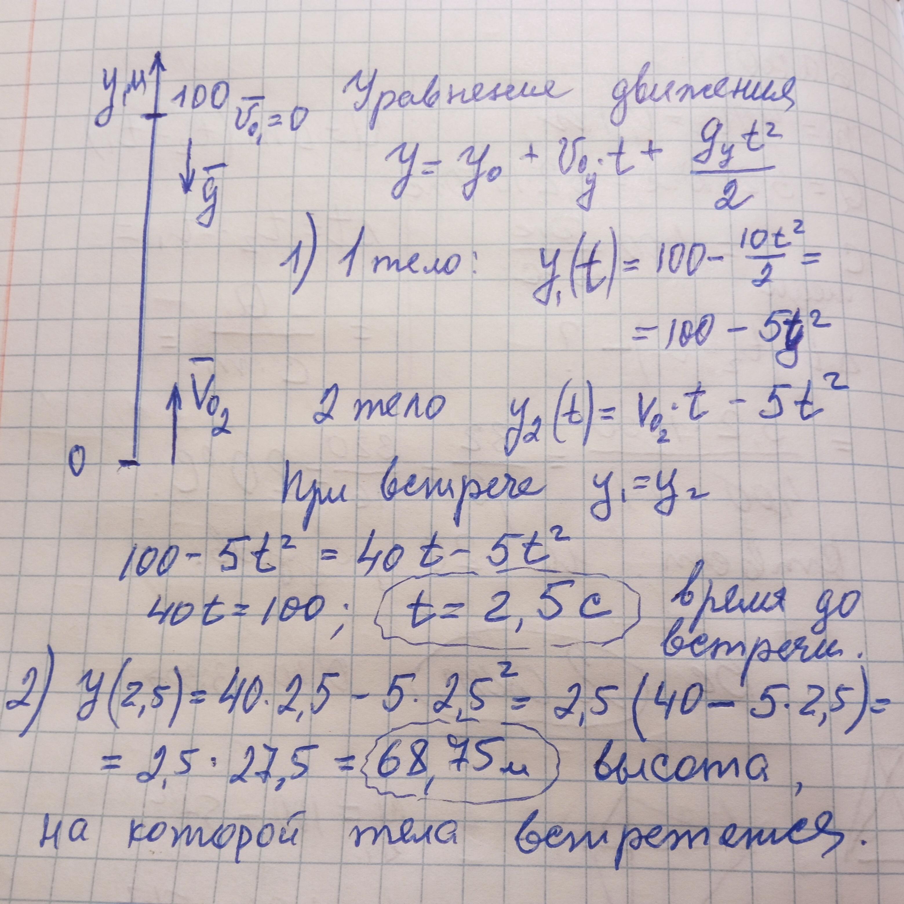 З висоти 100м почав падати камінь. Одночасно з поверхні землі назустріч йому кинули вертикально вгору мяч зі швидкістю 40 м/с. Через який проміжок часу і на якій висоті над поверхнею землі вони зустрінуться?