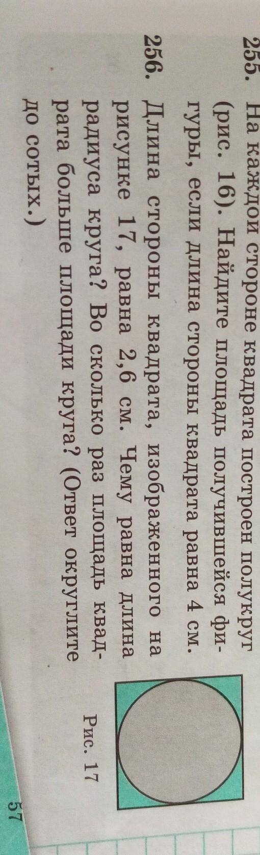 256. Длина стороны квадрата, изображенного на рисунке 17, равна 2,6 см. Чему равна длина радиуса круга? Во сколько раз площадь квад- рата больше площади круга? (Ответ округлите до сотых.) 255 не надо