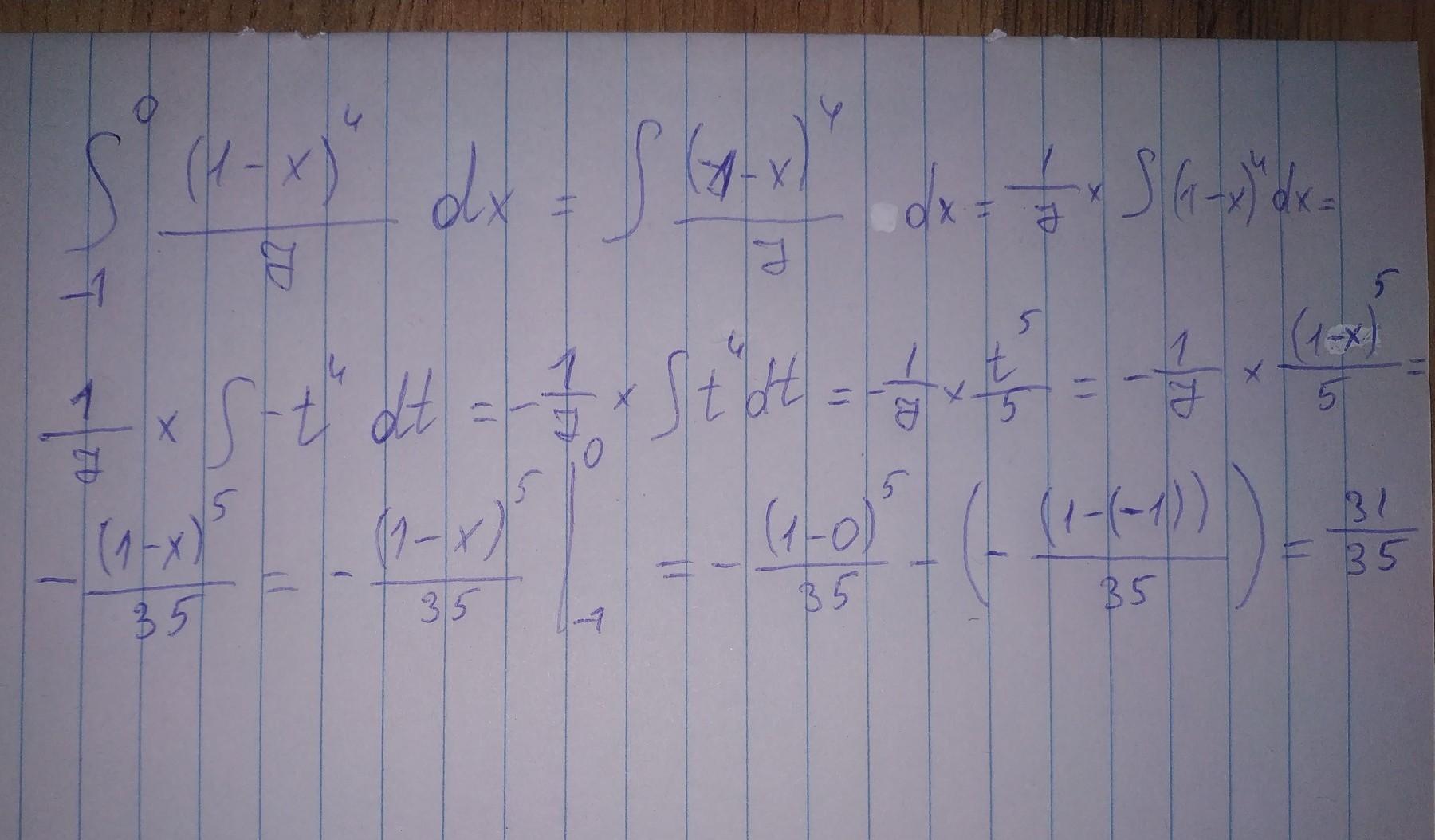 ∫₋₁⁰(1-x)⁴/7 ·dx=(-(1-x)⁵/35) |₋₁⁰