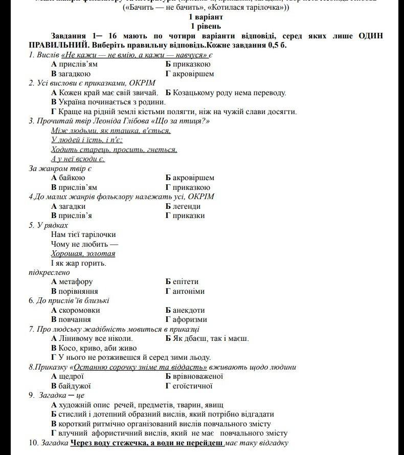 Контрольна робота №1 Малi жанри Фольклору та літератури (прислів'я, приказки, загадки; творчiсть Леоніда Глібова («Бачить - не бачить», «Котилася тарілочка») Завдання 1- 16 мають по чотири варіанти відповіді, серед яких лише одиН ПРАВИЛЬНИЙ. Виберіть правильну відповідь.Кожне завдання 0,5 б. 1. Вислiв «Не кажи - не вмію, а кажи - навчуся» є Б приказкою Г акровіршем А прислів'ям В загадкою 2. Усі вислови є приказками, ОКРІМ А Кожен край має свій звичай. Б Козацькому роду нема переводу. В Україна починається з родини. Г Краще на рiднiй землi кiстьми полягти, ніж на чужій слави досягти. 3. Прочитай твір Леоніда Глібова «Що за птиця?» людьми, як пташка, в'ється, Мiж У людей i iсть, і п'є: Ходить старець, просить гнеться. А у неï всюди є. За жанром твір є А байкою 5. У рядках В прислів'ям 4.До малих жанрів фольклору належать усi, ОКРІМ А загадки В прислів'я Нам тієї тарілочки Чому не любить- Хорошая, золотая 1 як жар горить. підкреслено 1 варіант 1 рiвень А метафору в порівняння 6. До прислів'їв близькi А скоромовки В повчання Б акровіршем Г приказкою А щедрої В байдужої Б анекдоти Гафоризми 7. Про людську жадібність мовиться в приказцi А Лінивому все ніколи. 9. Загадка-це Б легенди Г приказки Б епітети Г антоніми В Косо, криво, аби живо Г У нього не розживешся й серед зими льоду. 8.Приказку «Останню сорочку зніме та віддасть» вживають щодо людини Б Як дбаєш, так і маєш. Б BpiBHoBaжeHOЇ Г егоїстичної А художній опис речей, предметів, тварин, явищ Б стислий і дотепний образний вислів, який потрібно відгадати В короткий ритмічно організований вислів повчального змісту Г влучний афористичний вислів, який не має повчального змісту 10. Загадка Через воду стежечка, а води не перейдеш має таку відгадку