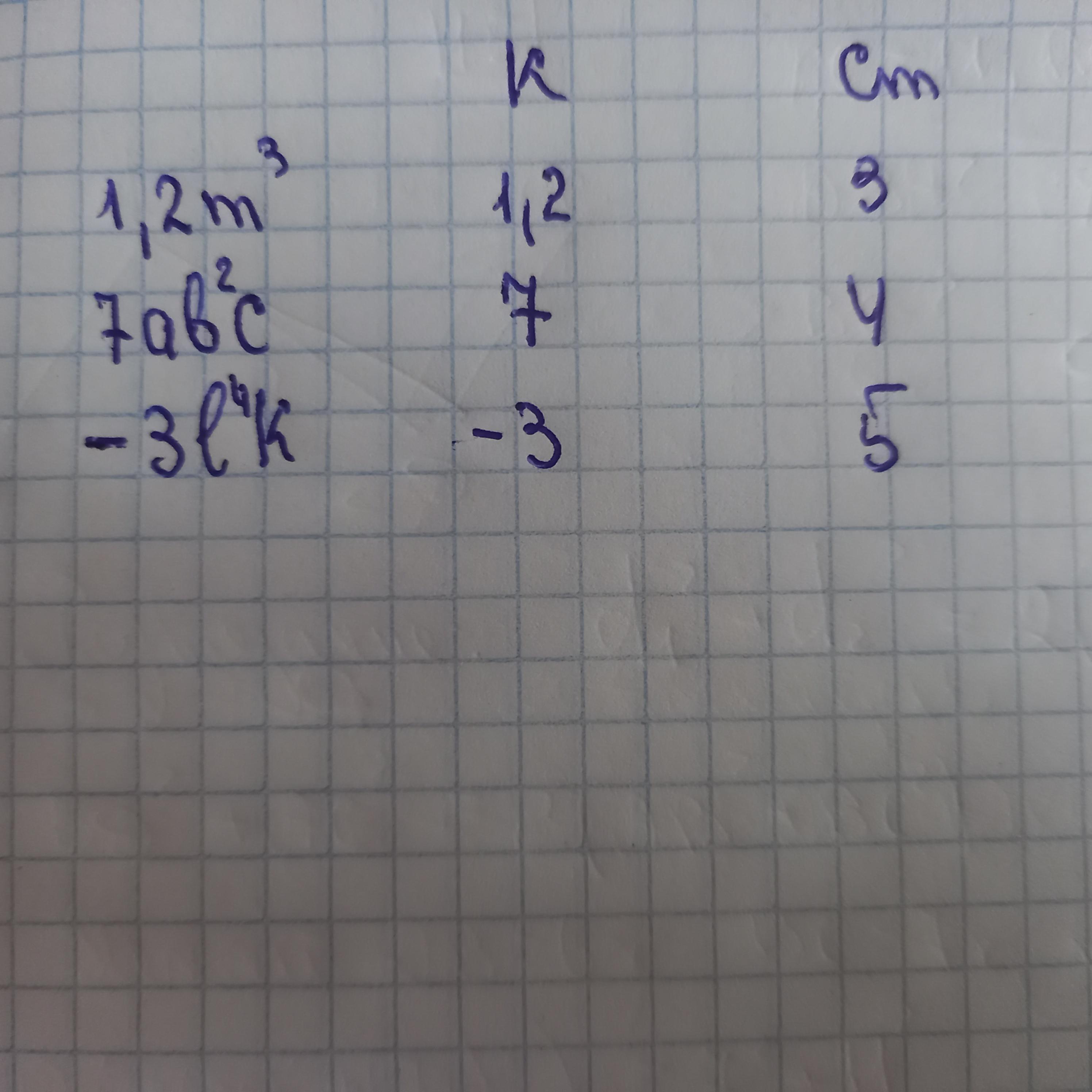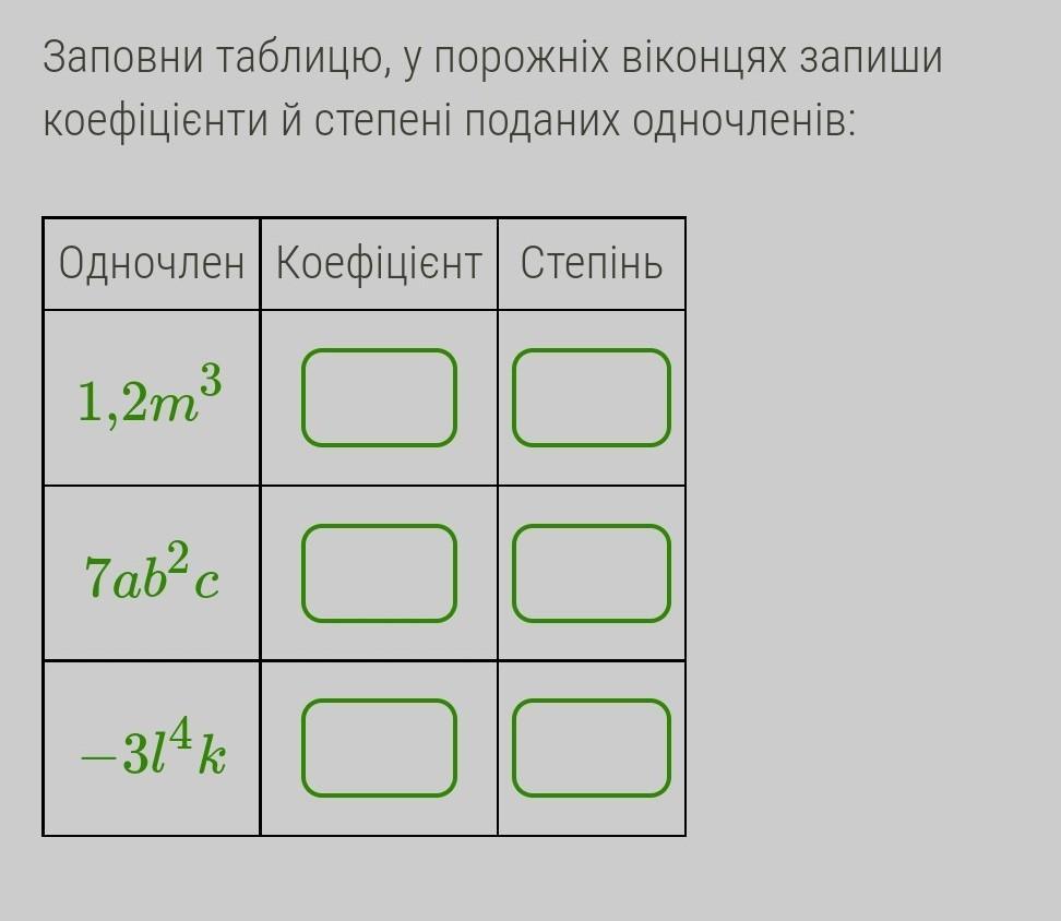 Заповни таблицю, у порожніх віконцях запиши коефіцієнти й степенi поданих одночленів: Одночлен Коефiцiєнт Степiнь 1,2m³; 7ab²c ; - 3l⁴ k