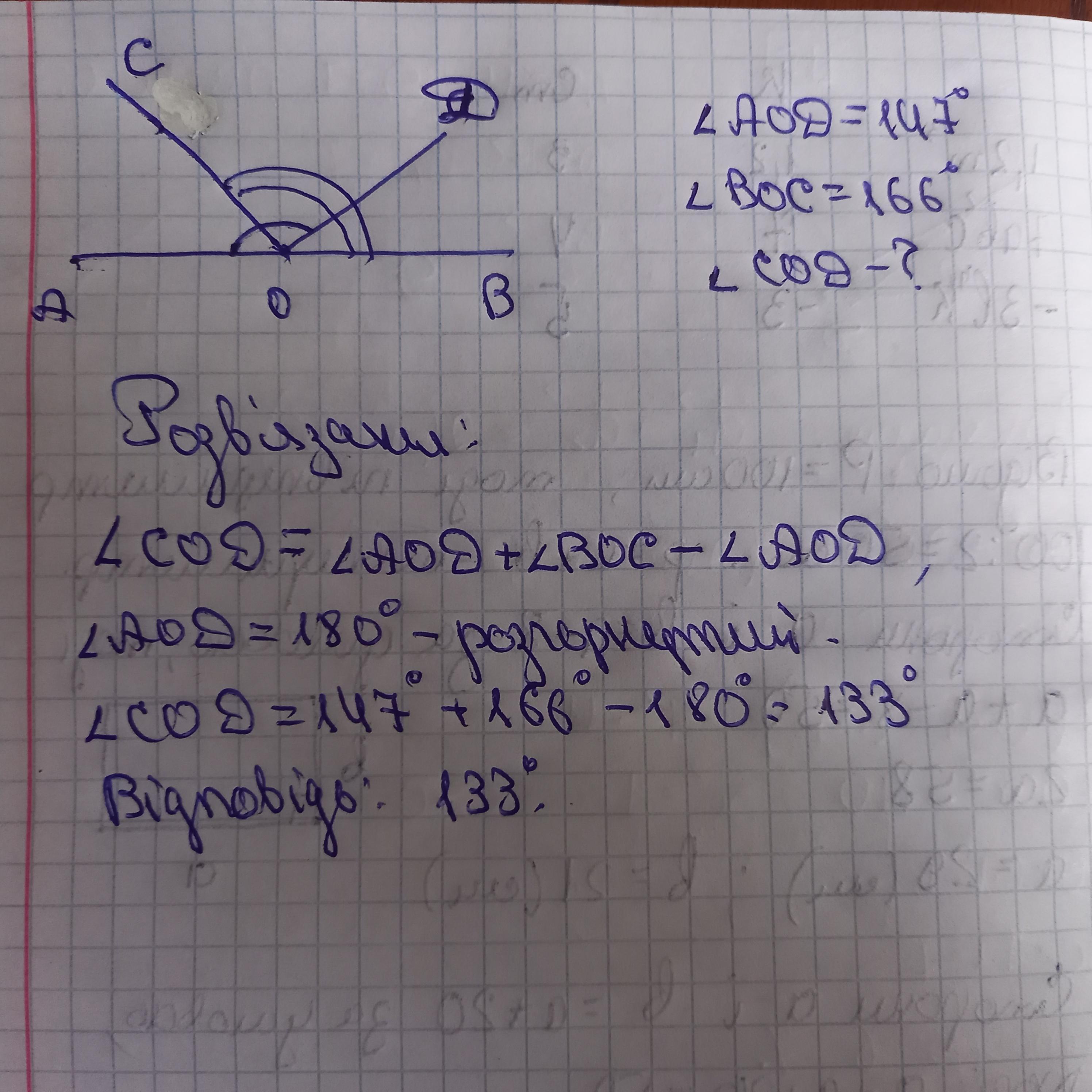= 147°, ВОС = 166o. Обчисліть величину кута COD