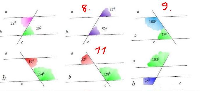 11. вертикальні кути рівні ( 52°) , сума внутрішніх односторонніх кутів 52°+128° =180° ⇒ а║b