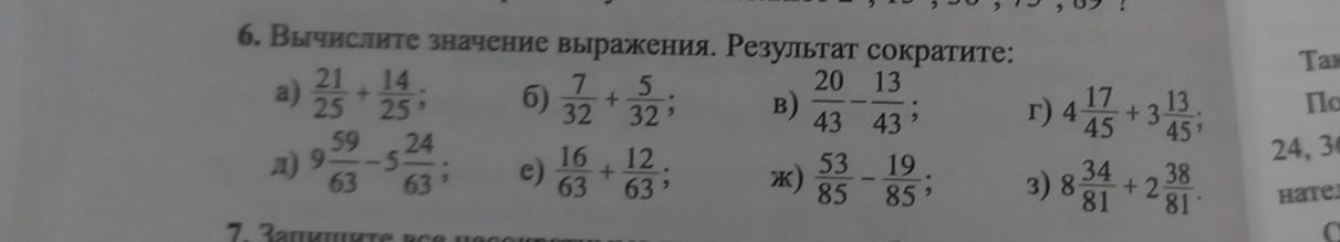 6. Вычислите значение выражения. Результат сократите: 5 20 13 B) 32' 43 43 53 85 21 a) is 25 25 4) 959 63 24 63 б) 7 32 16 63 12. 63 ж) 19 85' 13 17 45' г) 4 45 34 38 +2 81 3) 8 gl