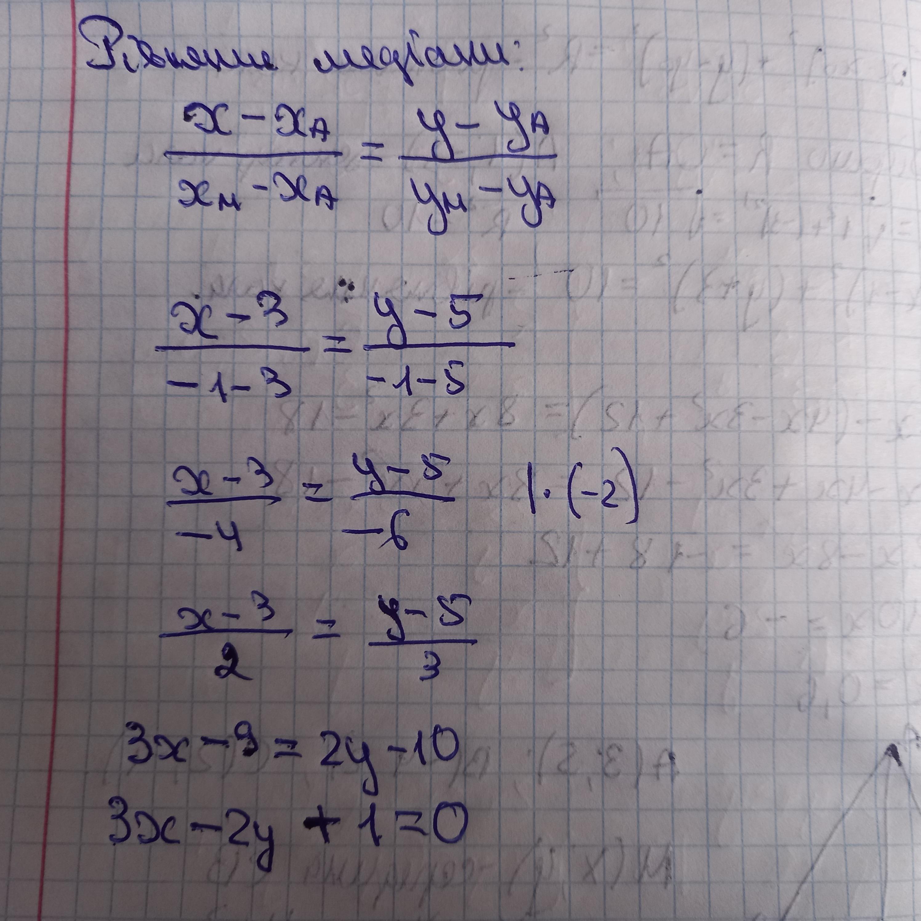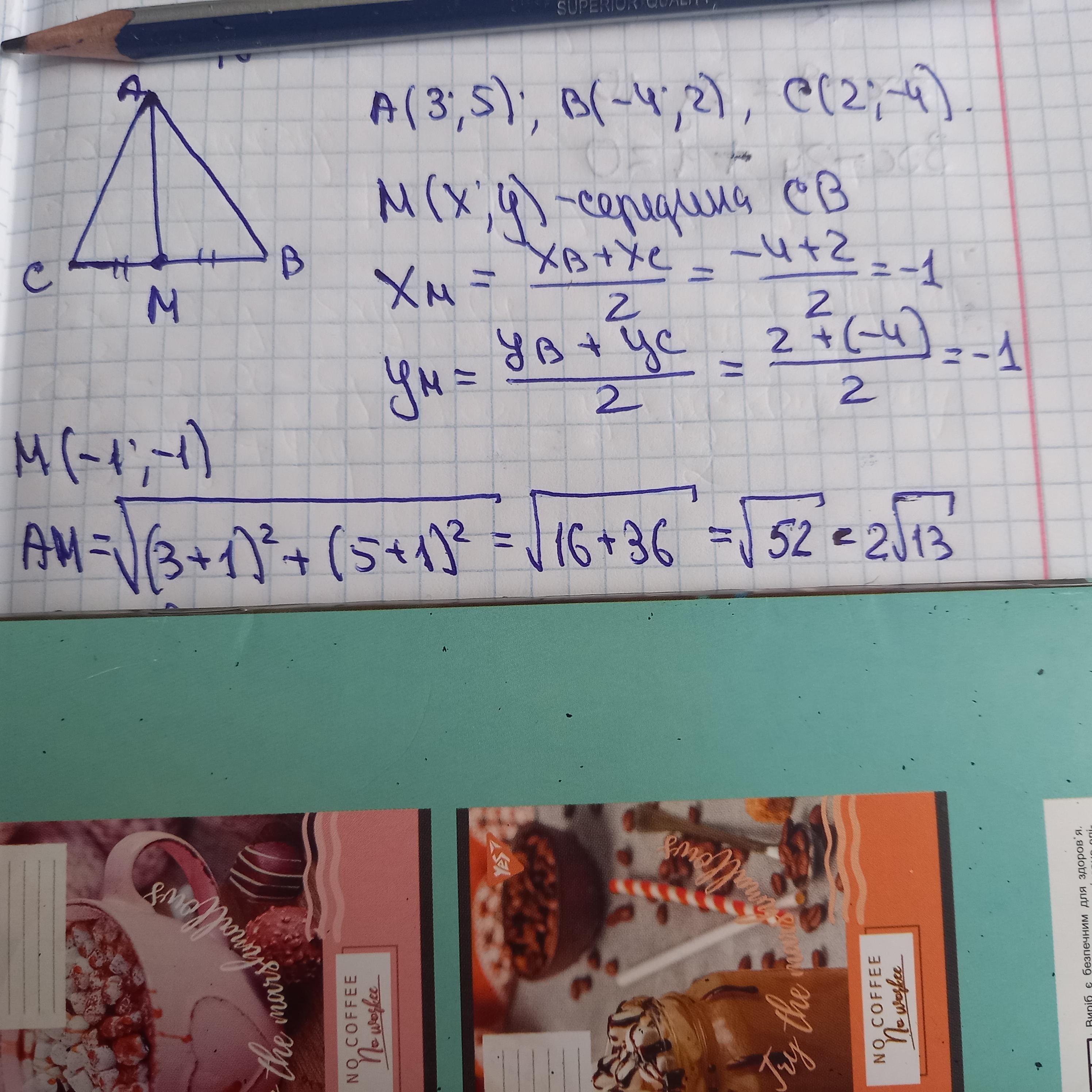 напишіть рівняння медіани АМ трикутник АВС і знайдіть її довжину, якщо А(3;5), В(-4; 2), С(2;-4)