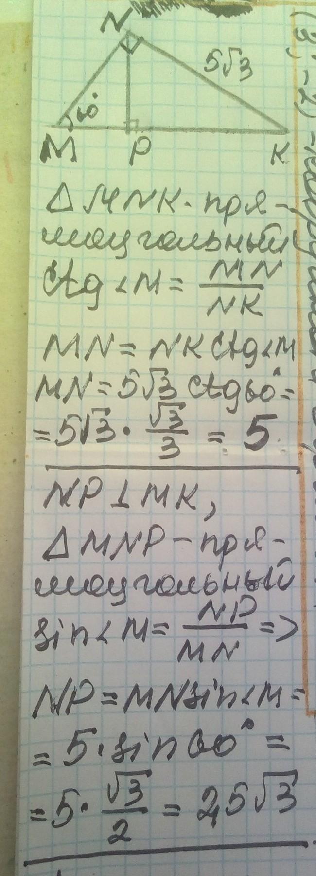 В треугольнике MNK ∠N = 90°, ∠M = 60° , NK = 5√3. Найдите:
