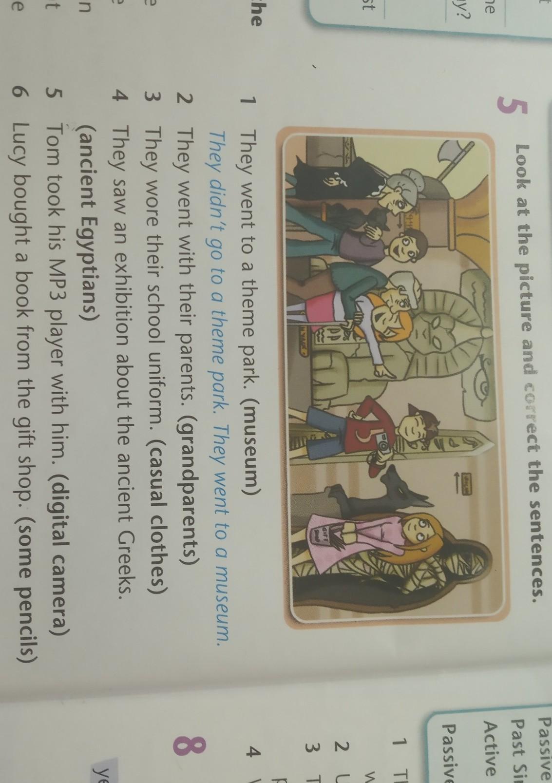 5 Look at the picture and correct the sentences. F 1 They went to a theme park. (museum) 2 They didn't go to a theme park. They went to a museum. They went with their parents. (grandparents) They wore their school uniform. (casual clothes) 4 They saw an exhibition about the ancient Greeks. 3 (ancient Egyptians) 5 Tom took his MP3 player with him. (digital camera) 6 Lucy bought a book from the gift shop. (some pencils)