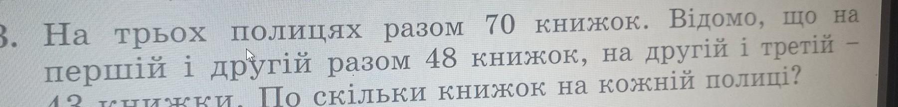 На трьох полицях разом 70 книжок. Відомо, що на першій і другій разом 48 книжок, на другій і третій 43 книжки. По скільки книжок на кожній полиці?