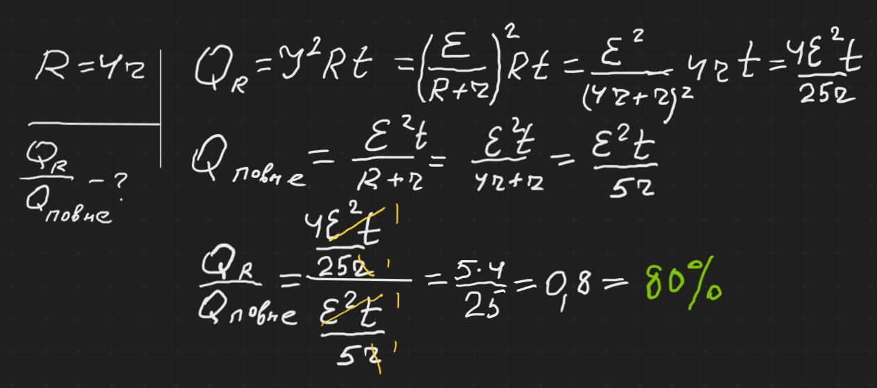 До джерела струму підключили резистор, опір якого в 4 рази більший за внутрішній опір джерела. На резисторі виділилася певна кількість теплоти. Визначте, яку частку у відсотках вона становить від загальної кількості теплоти, що виділилася в електричному колі.