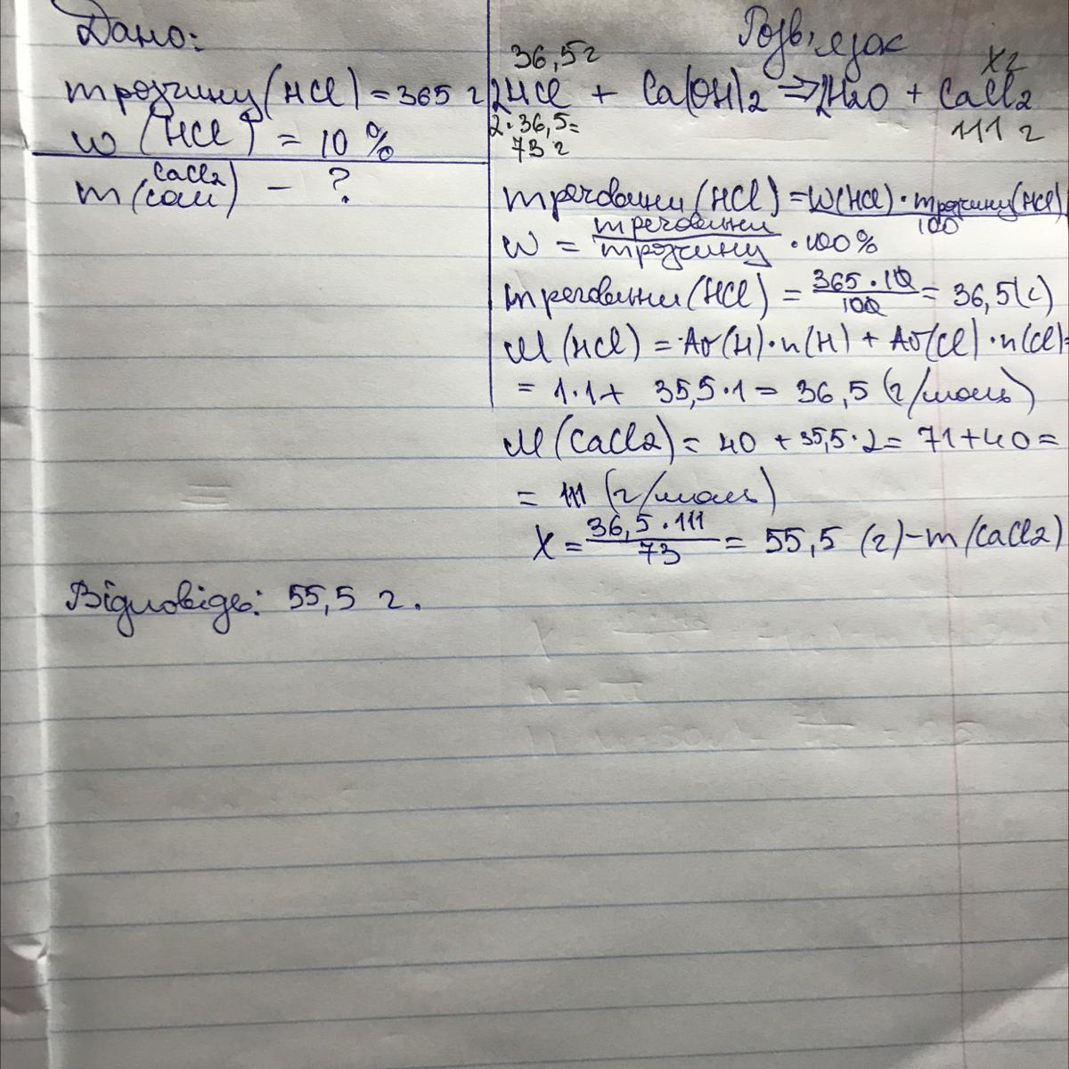 2. Розчин хлоридної кислоти масою 365 г із масовою часткою кислоти 10% повністю нейтралізували кальцій гідроксидом. Обчислити масу утвореної солі.