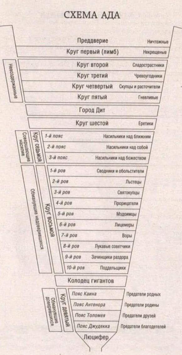 2—5-й круги для невоздержанных, 6-й круг для еретиков и лжеучителей, 7-й круг для насильников, 8—9-й — для обманщиков (8-й — просто для обманщиков, 9-й — для предателей).