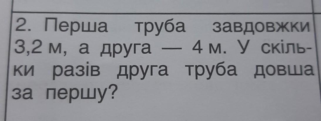 Перша труба завдовжки 3,2 м, а друга — 4 м. У скільки разів друга труба довша за першу?