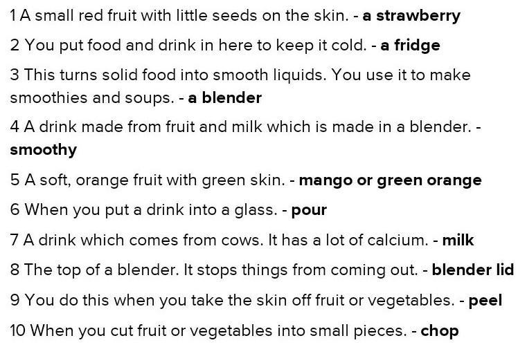 2 Write, using the words from the picture above. We like fruit and milk, so we often drink' smoothies at home. We make our smoothies with a ² He 4 . My brother's favourite fruit are little red ³ them with a knife when we make smoothies. I prefer 5 them. but you have to take off the skin and it is hard to We put the fruit in the blender. Then I take a carton of 7 8 . I carefully ⁹ I always remember to put the 10 on the blender because we don't want to have smoothie all over the walls! I switch it on and, in ten seconds, we have our smoothies ready to drink! it into the blender. out of the