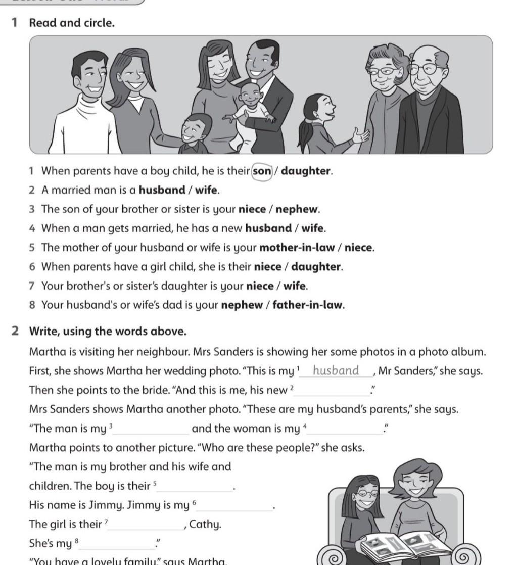 2 Write, using the words above. Martha is visiting her neighbour. Mrs Sanders is showing her some photos in a photo album. First, she shows Martha her wedding photo. "This is my husband Mr Sanders," she says. Then she points to the bride. "And this is me, his new ² Mrs Sanders shows Martha another photo. "These are my husband's parents," she says. 4 "The man is my 3 and the woman is my Martha points to another picture. "Who are these people?" she asks. "The man is my brother and his wife and children. The boy is their 5 His name is Jimmy. Jimmy is my 6 The girl is their She's my 8 "You have a lovely family," says Martha. I Cathy. "
