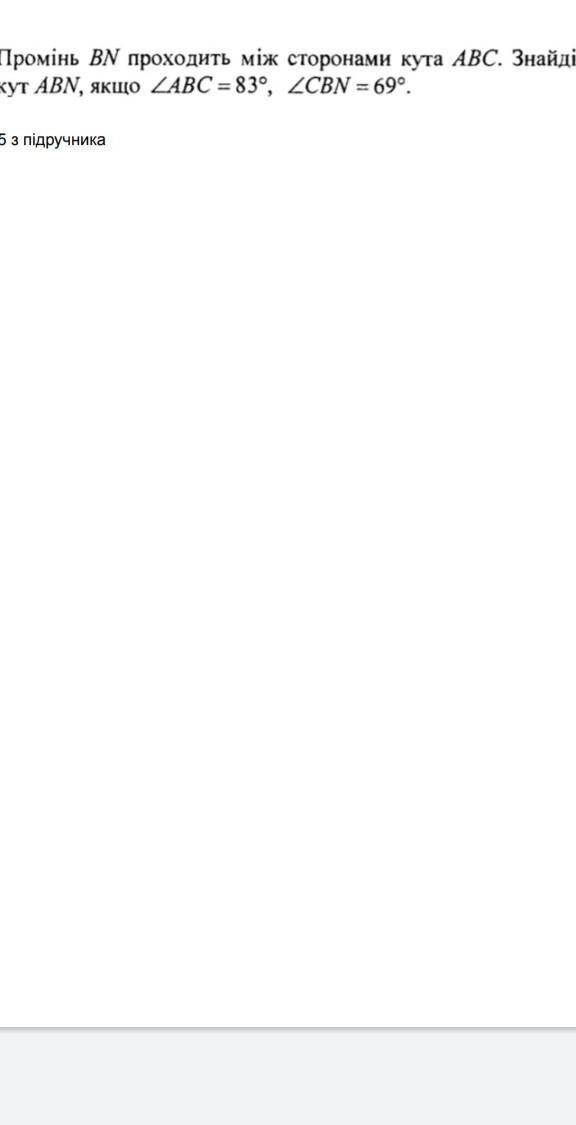 Пояснення: Щоб знайти кут ABN, потрібно відняти градусну міру кутів ABC i CBN. Виходить: 83°-69°= 14°