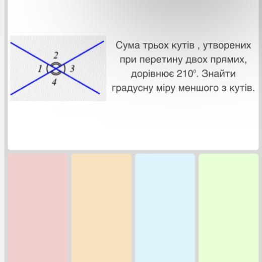 Ответ:Якщо кути 1,2 та 3 у сумі дорівнюють 210 градусів, тоді кут 4=360-210=150 градусів.