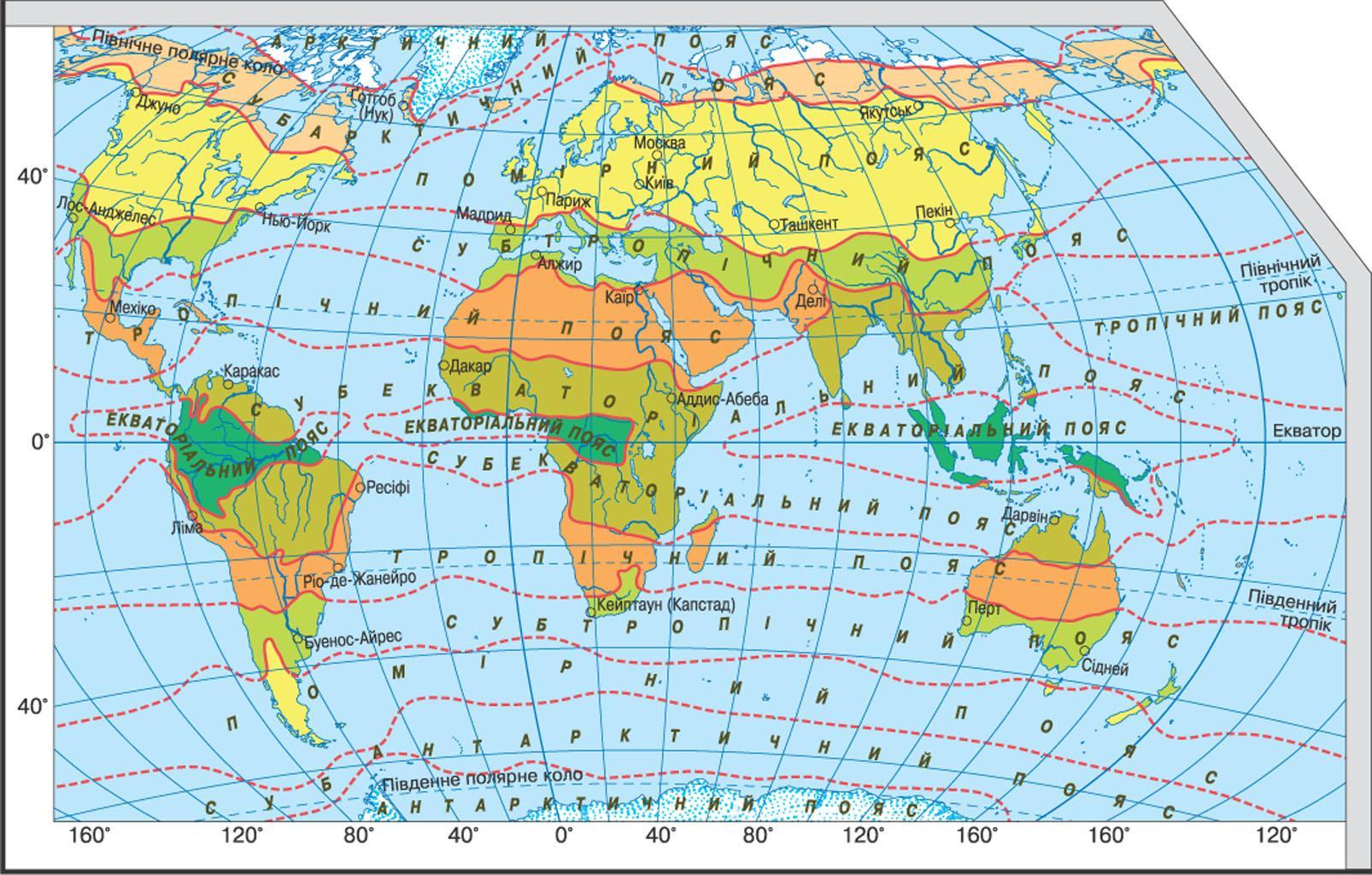 Географічні (природні) пояси – це природні комплекси, які широкими смугами простягаються у широтному напрямку і змінюють один одного від екватора до полюсів. Географічні пояси різняться між собою кількістю тепла, переважаючими повітряними масами і пануючими вітрами. Географічні пояси називаються за відповідними кліматичними поясами. На земній кулі виділяють 13 географічних поясів: екваторіальний, два субекваторіальних, два тропічних, два субтропічних, два помірних, два субполярних (субарктичний і субантарктичний) і два полярних (арктичний і антарктичний).