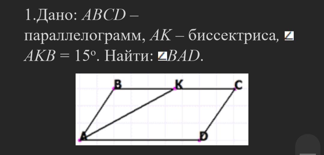 Т.к. АК биссектриса , то угол ВАК= углу КАD и равен 15°