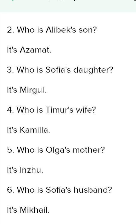 Language point: Possessive s 4 ★★★ Look at the family tree in exercise 3. Write questions about the people and answer them. who/Alibek / father? Who is Alibek's father? It's Timur. 1 who/Azamat/sister? 2 who/Alibek / son? 3 who/Sofia/daughter? 4 who/Timur / wife? 5 who/Olga / mother? 6 who/Sofia / husband?