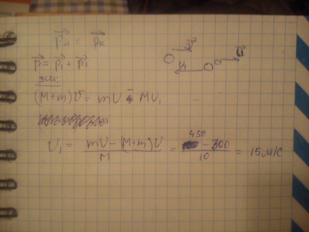 Ядро, летевшее горизонтально со скоростью V = 20 м/с, разорвалось на два осколка. Массы осколков m = 5 кг и M = 10 кг. Скорость меньшего осколка равна U = 90 м/c и направлена так же, как и скорость ядра до разрыва. Найдите скорость и направление движения большего осколка.