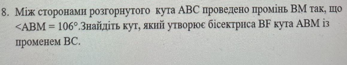 Кут ABM÷2 = 106÷ 2 = 53°( бісектриса BF )