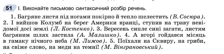 1.Багряне листя під ногами покірно й тепло шелестить. (Речення розповідне, неокличне, просте, двоскладне, поширене).І вийшов(присудок)