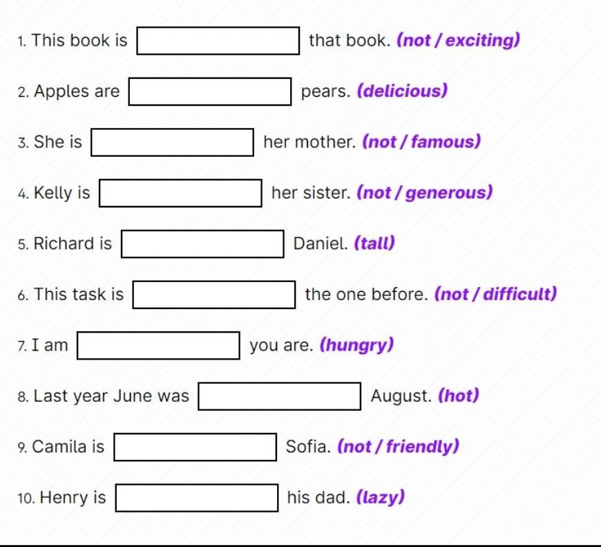 Ответ: not as exciting as, as delicious as, not so famous as, not so generous, as tall as, not so difficult as, as hungry as, as hot as,