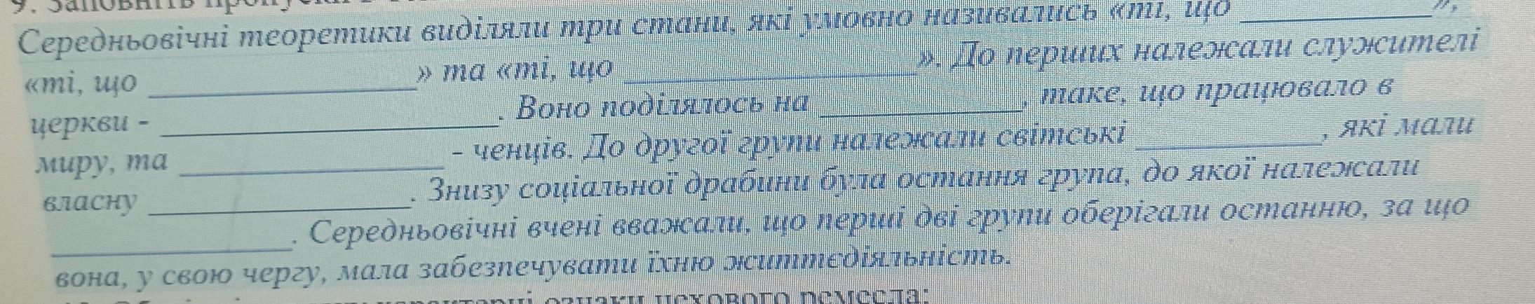 Середньовічні теоретики виділяли три стани, які умовно називались «ті, що > ma «mi, 40 «mi, що церкви - миру, та власну », >>. До перших належали служителі mаке, що працювало в які мали Воно поділялось на ченців. До другої групи належали світські 3 Знизу соціальної драбини була остання група, до якої належали Середньовічні вчені вважали, що перші дві групи оберігали останню, за що вона, у свою чергу, мала забезпечувати їхню життєдіяльність.