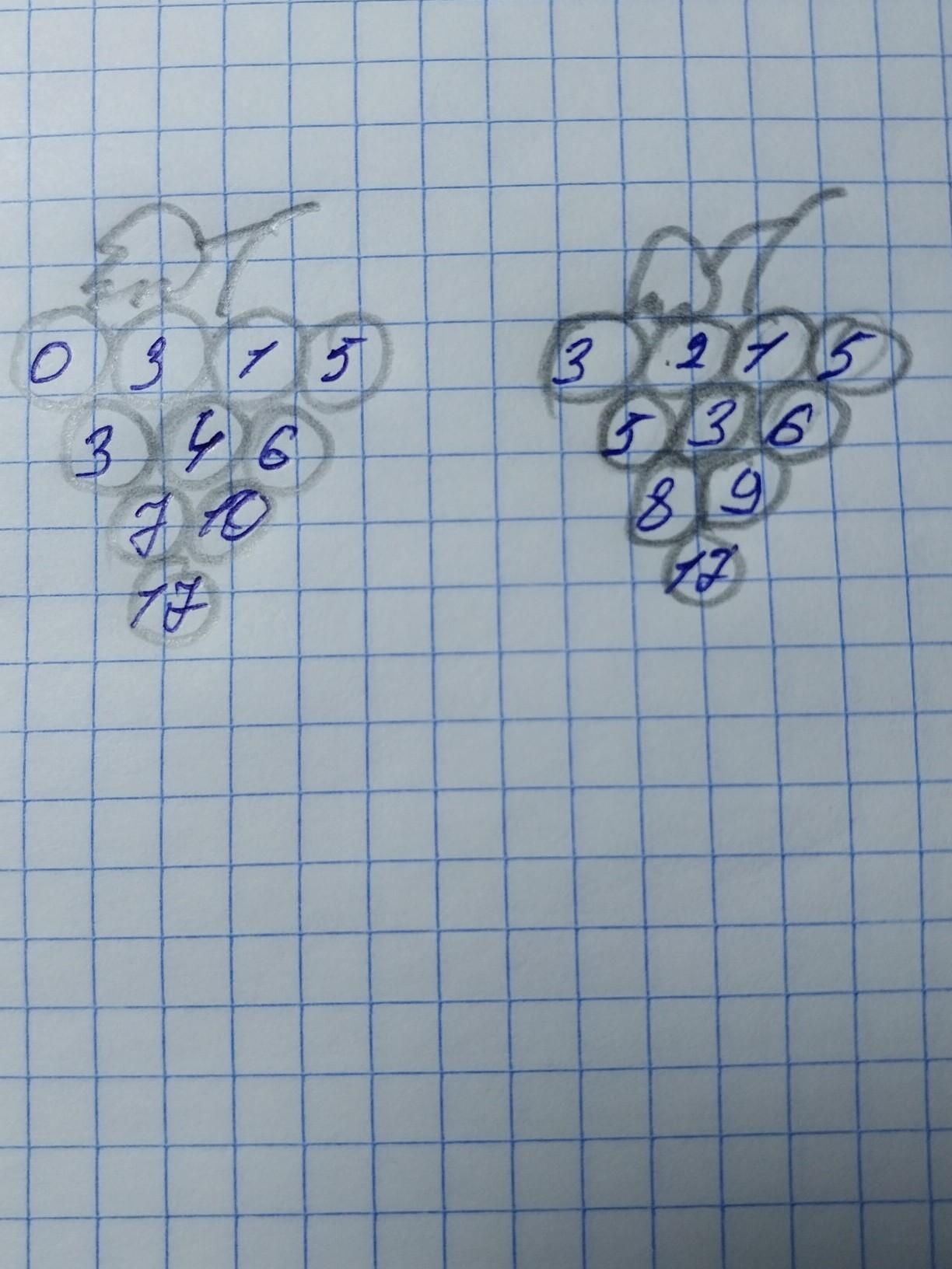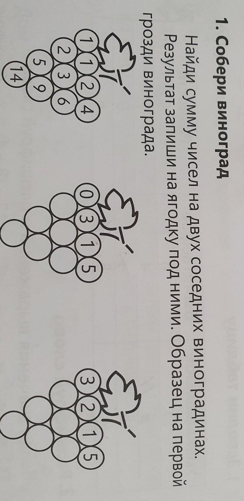 Найди сумму чисел на двух соседних винограденах. результат Запиши на ягодку под ними .образец на первой грозди винограда