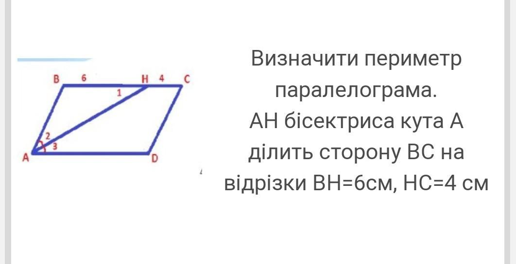 АВ=ВН=СD=6 см (бісектриса відсікає від паралелограма рівнобедрений трикутник, тому АВ=ВН=6 см)