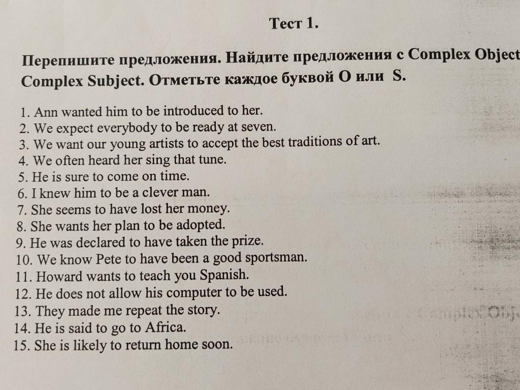TecT 1. Перепишите предложения. Найдите предложения с Complex Object и Complex Subject. Отметьте каждое буквой О или S. 1. Ann wanted him to be introduced to her. 2. We expect everybody to be ready at seven. 3. We want our young artists to accept the best traditions of art. 4. We often heard her sing that tune. 5. He is sure to come on time. 6. I knew him to be a clever man. 7. She seems to have lost her money. 8. She wants her plan to be adopted. 9. He was declared to have taken the prize. 10. We know Pete to have been a good sportsman. 11. Howard wants to teach you Spanish. 12. He does not allow his computer to be used. 13. They made me repeat the story. 14. He is said to go to Africa. 15. She is likely to return home soon. pletObj.čí