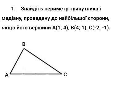 середину ВС т . М=((Вх+Сх)/2; (Ву+Су)/2)=((4-2)/2;(1-1)/2)=(1;0)