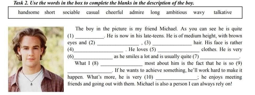 1. Handsome 2. Long 3. Wavy 4.short (?) 5.casual 6.sociable 7. Talkative 8.admire 9.cheerful 10.ambitious