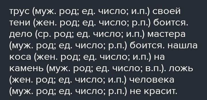 ского запиши прави 4. Исправь ошибки в пословицах и ные версии. Определи род, число и падеж существительны Трус своей лени боится. Тело мастера боится. Нашла коза на камень. Лось человека не красит. Káмен к