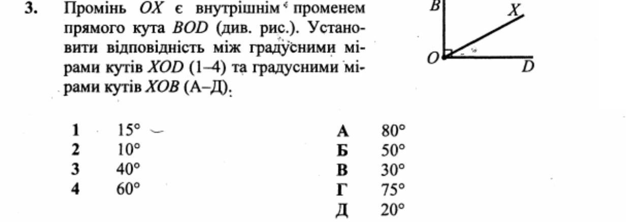 вити відповідність між градусними мі-рами кутів XOD (1-4) та градусними мі-.рами кутів ХОВ (А-Д).