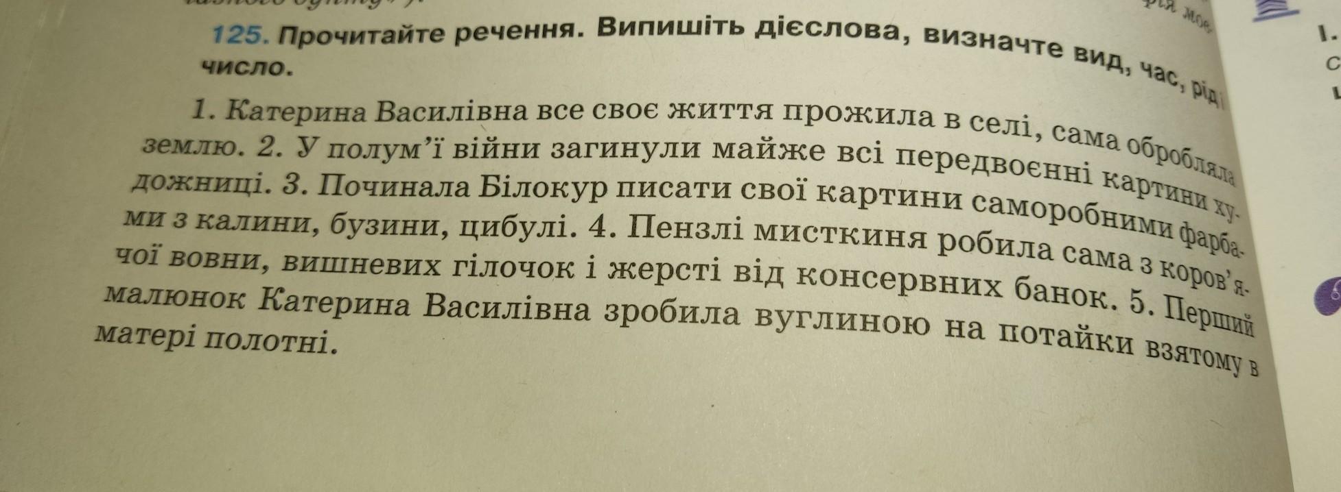 1. прожила (доконаний, минулий, жіночий рід, однина), обробляла (недоконаний, минулий, жіночий рід, однина). 2. загинули (доконаний, минулий, жіночий рід, множина). 3. починала (недоконаний, минулий, жіночий рід, однина), писати (недоконаний, минулий, жіночий рід, однина). 4. робила (недоконаний, минулий, жіночий рід, однина). 5. зробила (доконаний, минулий, жіночий рід, однина)