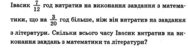 на задание по математике потратил 7/12 часа. Еще он делал литературу. Сказано, что 7/12 часа - это на 3/20 часа больше, чем на литературу. Т.е. на литературу он потратил времени меньше, чем на математику. Сколько на литературу? Вот столько: