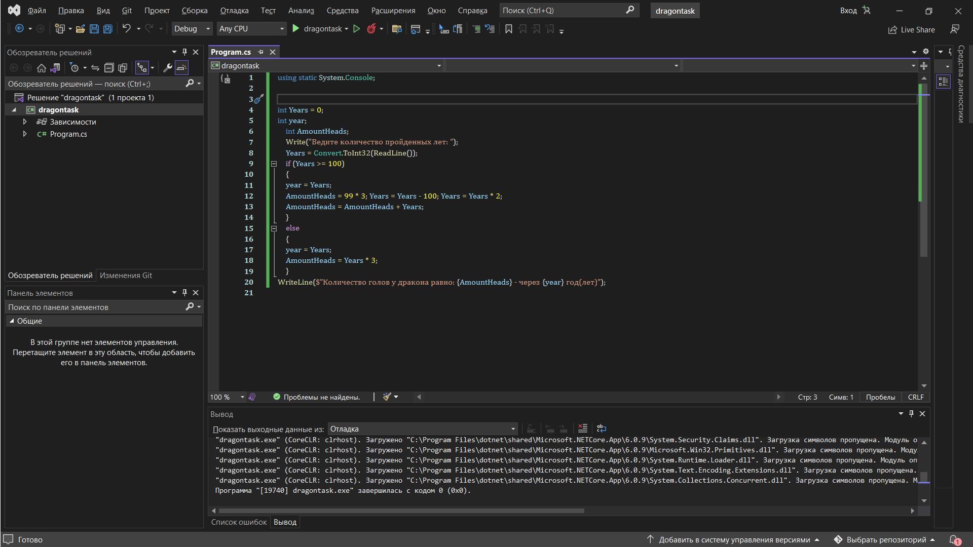 WriteLine($"Количество голов у дракона равно: {AmountHeads} - через {year} год(лет)");