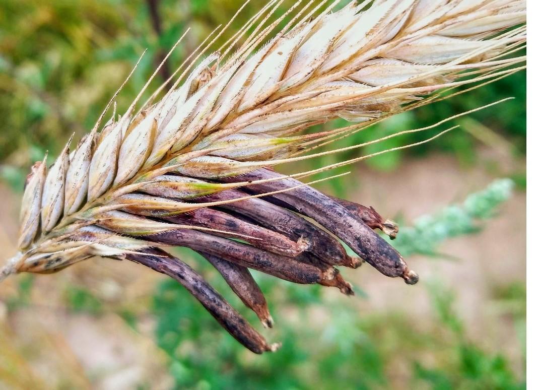 Склероции спорыньи на колосе злакового растения, содержащие большое количество алкалоидов.