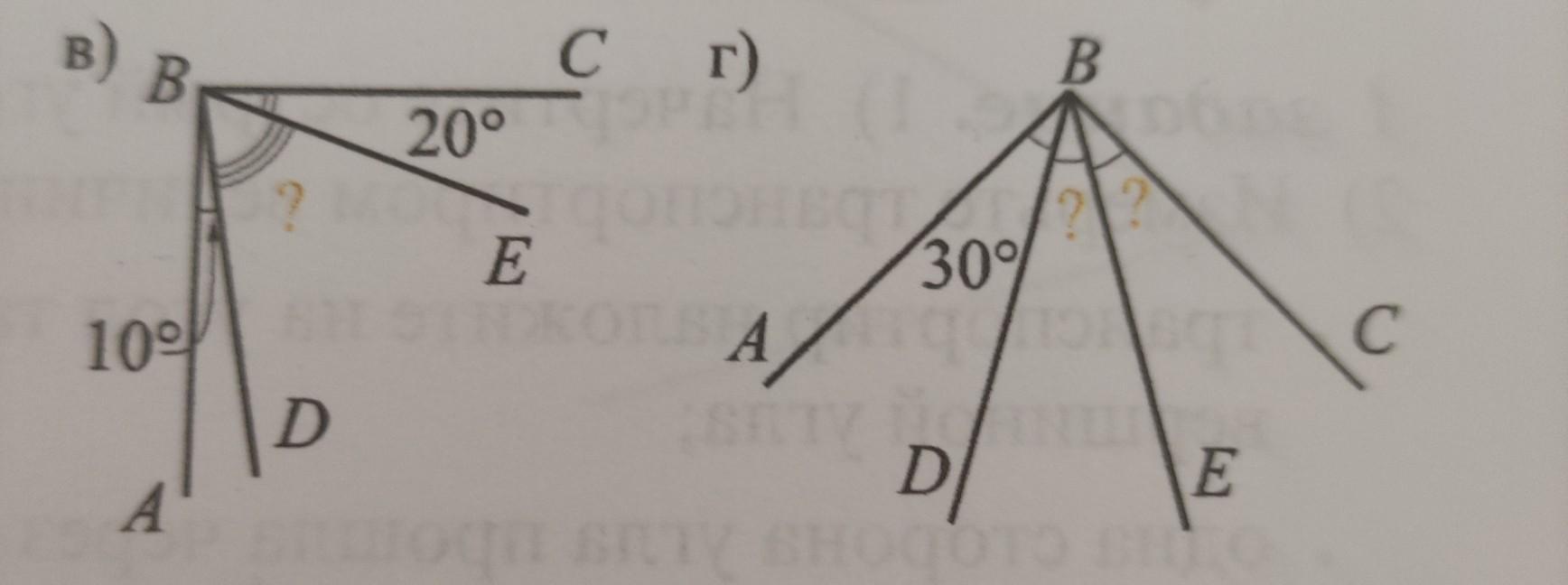 в) Поскольку угол АВС — прямой и равен 90°, АВС=ABD+DBE+EBC, то DBE=ABC-(ABD+EBC)=90°-(10°+20°)=60°.