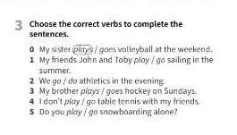 3 Choose the correct verbs to complete the sentences. 0 My sister plays/ goes volleyball at the weekend. 1 My friends John and Toby play/go sailing in the summer. 2 We go / do athletics in the evening. 3 My brother plays / goes hockey on Sundays. 4 I don't play/go table tennis with my friends. 5 Do you play / go snowboarding alone?