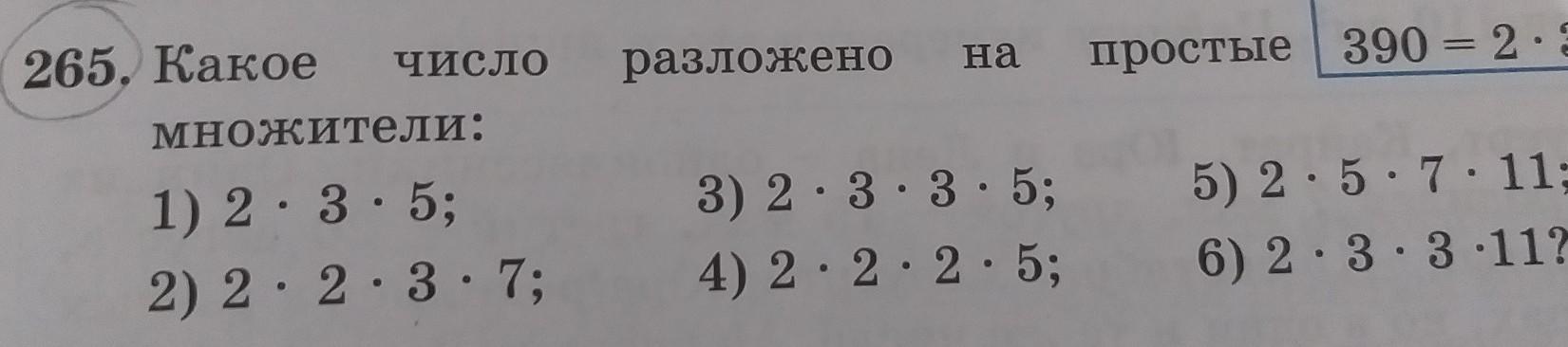 какое число разложенона простые множители: 1)2•3•5; 2)2•2•3•7 3)2•3•3•5 4)2•2•2•5 5)2•5•7•11 6)2•3•3•11