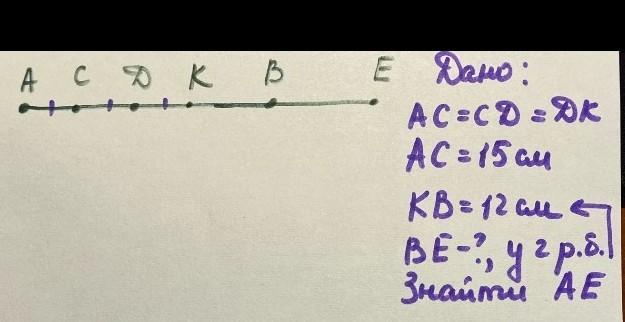так як АС=СД=ДК, тоді СД=15 см, ДК=15 см.