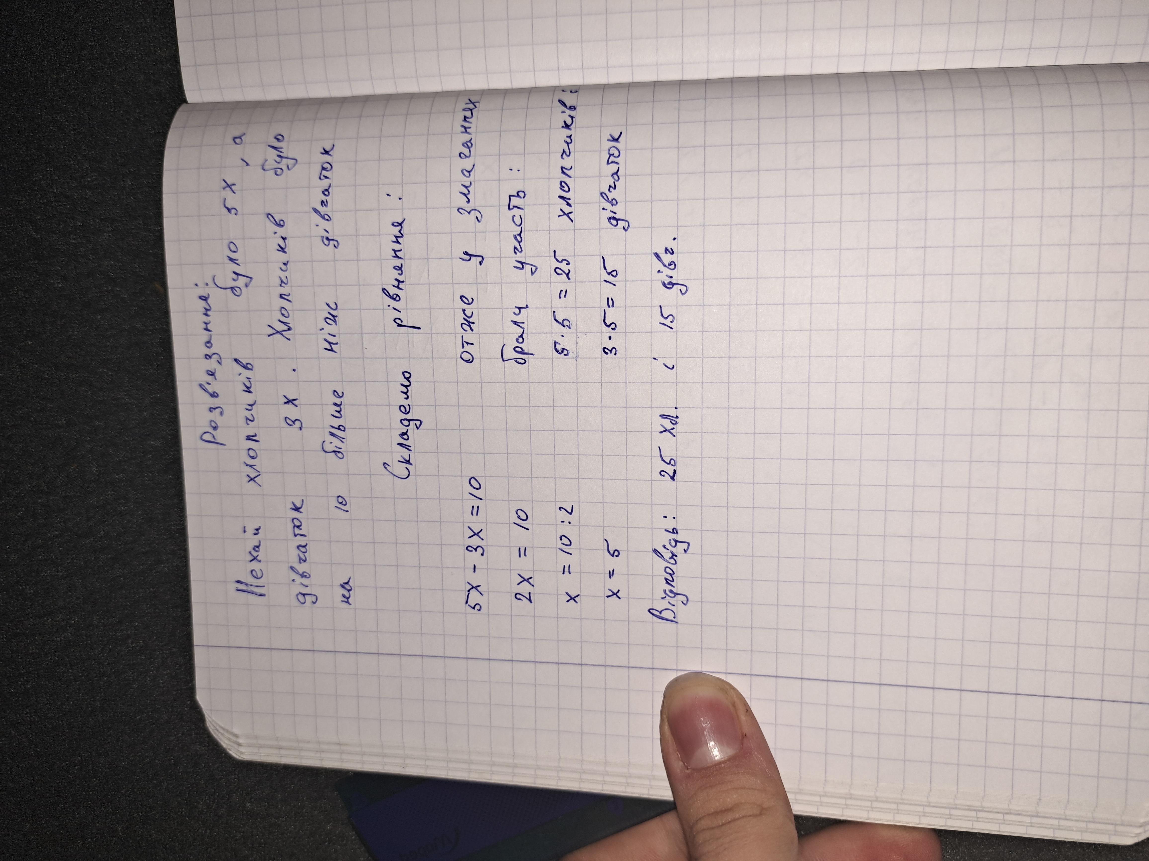 На міскій математичній олімпіаді кількість хлопчиків відносилася до кількості дівчаток 5 : 3 причому хлопчиків було на 10 більше ніж дівчаток. Скільки хлопчиків і скільки дівчаток брало участь у спортивних змаганнях?
