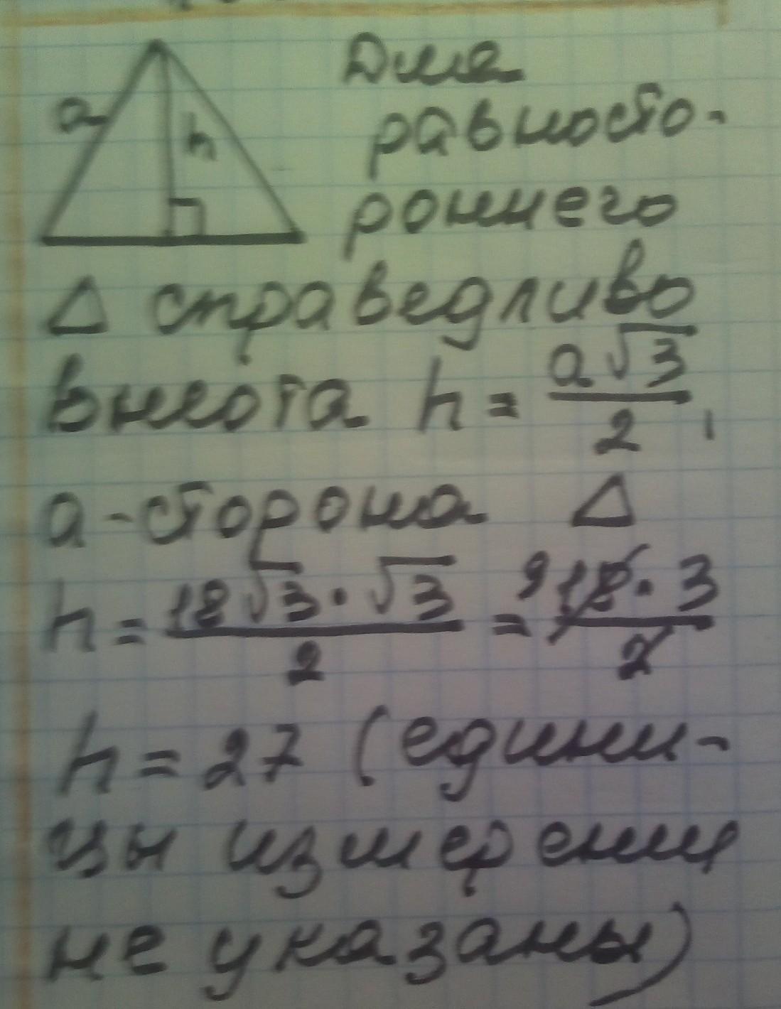 В равностороннем треугольнике сторона равна 18 корней из 3.Найдите высоту этого треугольника.