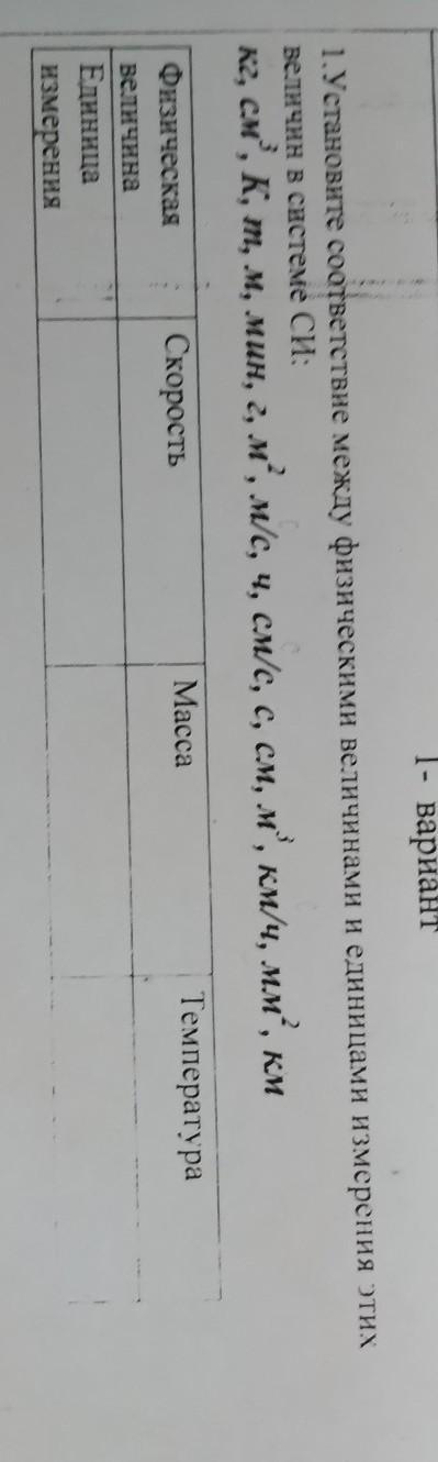 1. Установите соответствие между физическими величинами и единицами измерения этих величин в системе СИ: kz, см², k, m, м, мин, г, м², м/с, ч, см/с, с, см, м', км/ч, мм², ки Скорость Температура Macca СРОЧНО ПЖПЖПДПЖППЖПДПД